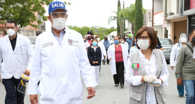 El secretario de Salud, Manuel de la O Cavazos, en compañía de la alcaldesa Cristina Díaz Salazar, visitó los hogares de esa zona, la cual cuenta con 17 mil habitantes y donde se ha reportado un número importante de casos.