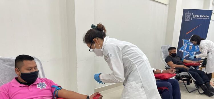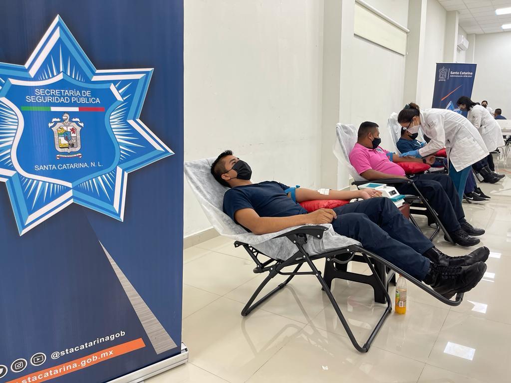 Como muestra de entrega hacia su ciudad, policías de Santa Catarina participaron en la campaña de donación de sangre organizada por la Red Hospitalaria de los Servicios de Salud en Nuevo León.