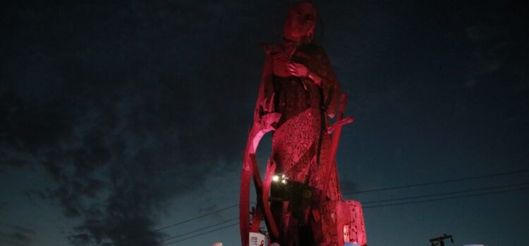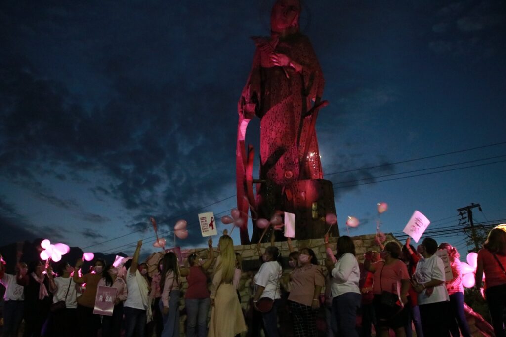 El Alcalde Jesús Nava Rivera, acompañado de la presidenta del DIF Municipal, Paola García, presenció la iluminación con reflectores color rosa de la Virgen, ubicada a la altura de la Avenida Díaz Ordaz, para reconocer también la lucha de las mujeres santacatarinenses que han padecido esta enfermedad.
