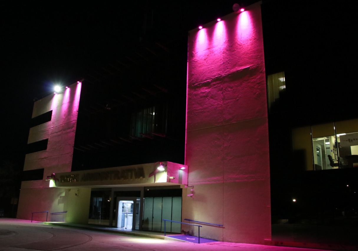 De manera simultánea la Torre Administrativa también lució iluminada con este color que simboliza la prevención del cáncer de mama.
