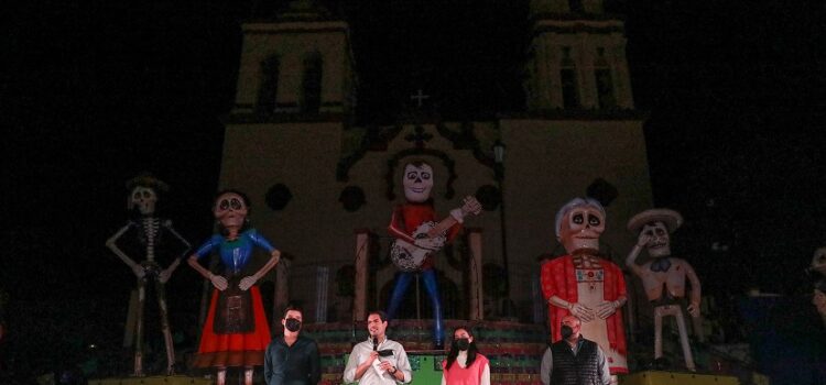 El Alcalde de Santiago, David de la Peña Marroquín, inauguró el majestuoso altar ubicado en la plaza principal de Villa de Santiago, el cual tiene como punto central a los personajes de la película “Coco», llenando de magia y color las escalinatas de la iglesia de Santiago Apóstol.