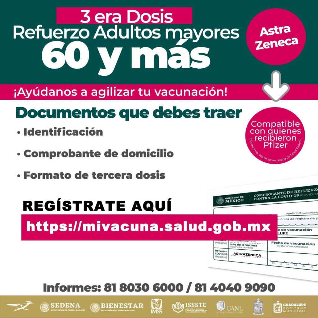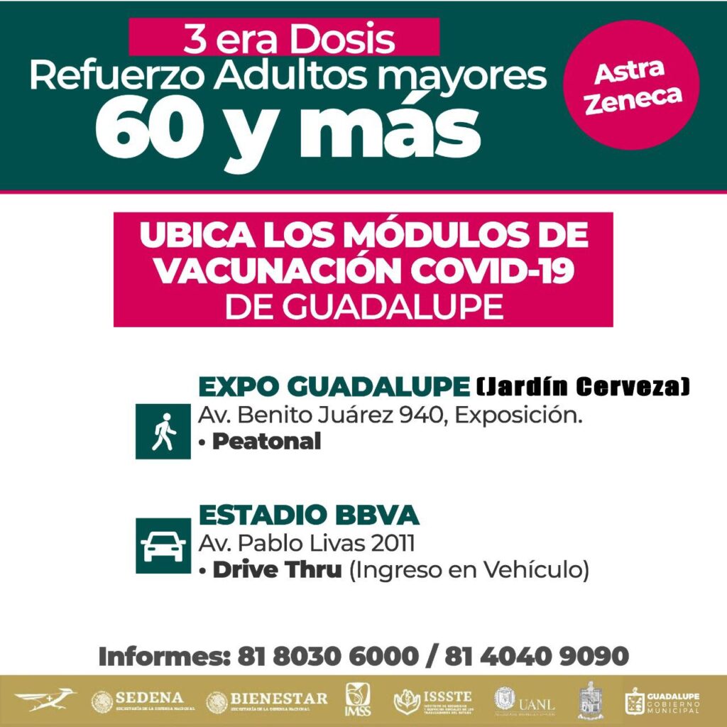 La tercera dosis reforzará la protección contra el Covid-19 para este segmento de la población, explicó Díaz, y los módulos de vacunación son el Estadio de Rayados con modalidad Drive Thru, y el Jardín Cerveza de la Expo Guadalupe que será peatonal.