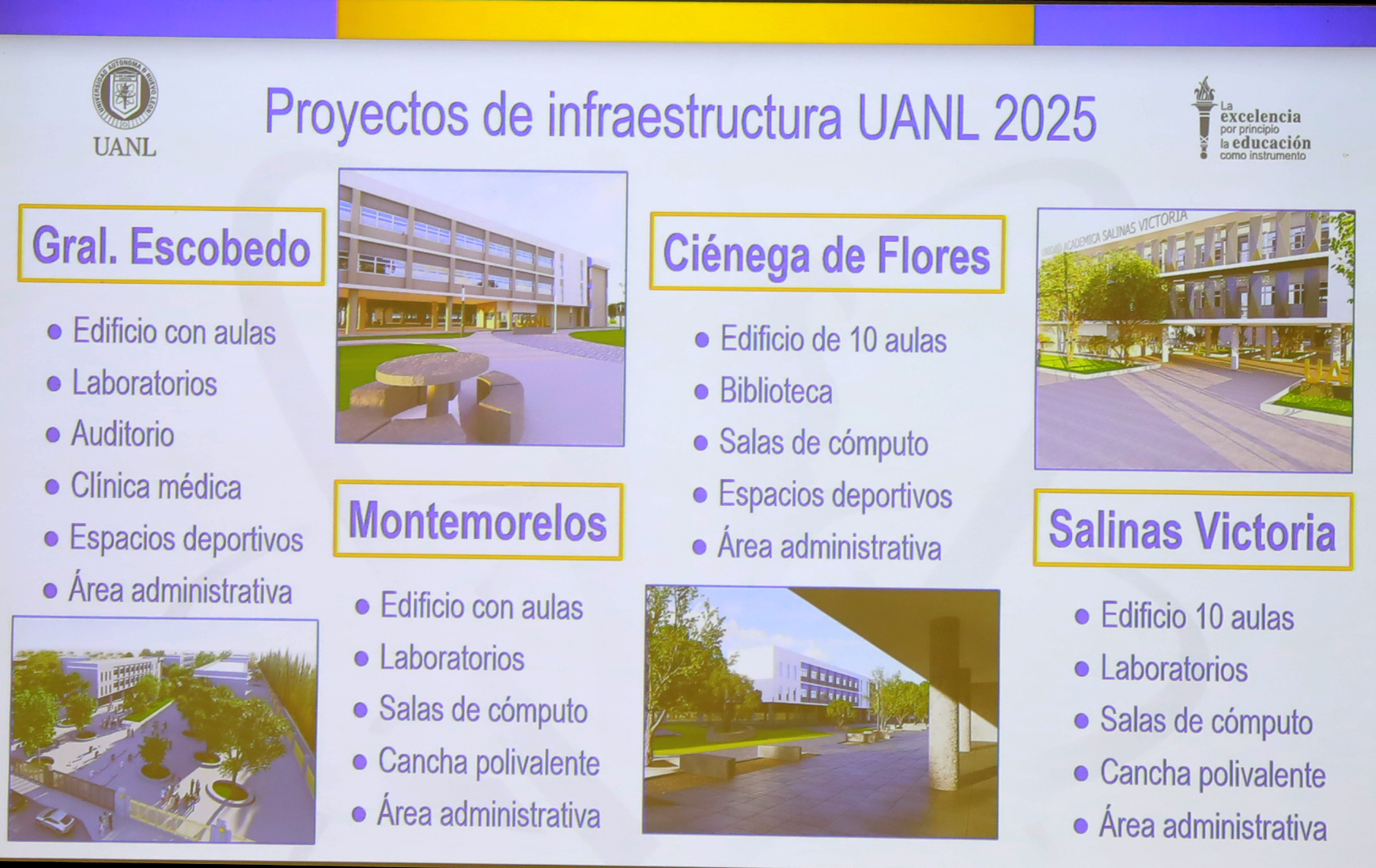 El Rector presentó los avances de los proyectos de infraestructura de la Universidad, además del presupuesto de inversión a la fecha y los objetivos de cada uno de estos proyectos. Asimismo, anunció la creación de nuevas unidades académicas en los municipios de General Escobedo, Montemorelos, Ciénega de Flores y Salinas Victoria.