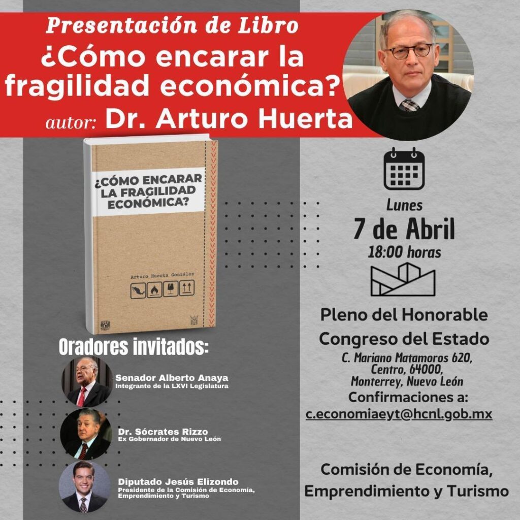 El libro ¿Cómo encarar la fragilidad económica? del economista nuevoleonés Arturo Huerta González, será presentado esta tarde de lunes 7 de abril, a las 18:00 horas, en el Salón del Pleno del Congreso del Estado de Nuevo León.