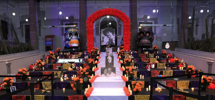 El altar ubicado en la escalinata de la entrada del Palacio Municipal contiene todos los elementos que le dan sentido a la celebración mexicana del Día de Muertos: el papel picado que le da color y alegría a la ofrenda; el retrato del recordado; los niveles que representan la tierra, el cielo y el limbo; el agua que es la fuente de la vida; el copal que se utiliza para limpiar el lugar de los malos espíritus, entre otros elementos.