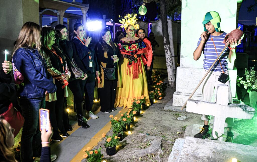 Los participantes en la experiencia montada en el Panteón Municipal Número 1 ubicado en la colonia Esmeralda disfrutaron además de un Cuenta Cuentos con relatos macabros, la presentación del trío Huasteco, un cancionero del Día de Muertos y al ballet folclórico del TEC de Nuevo León.
