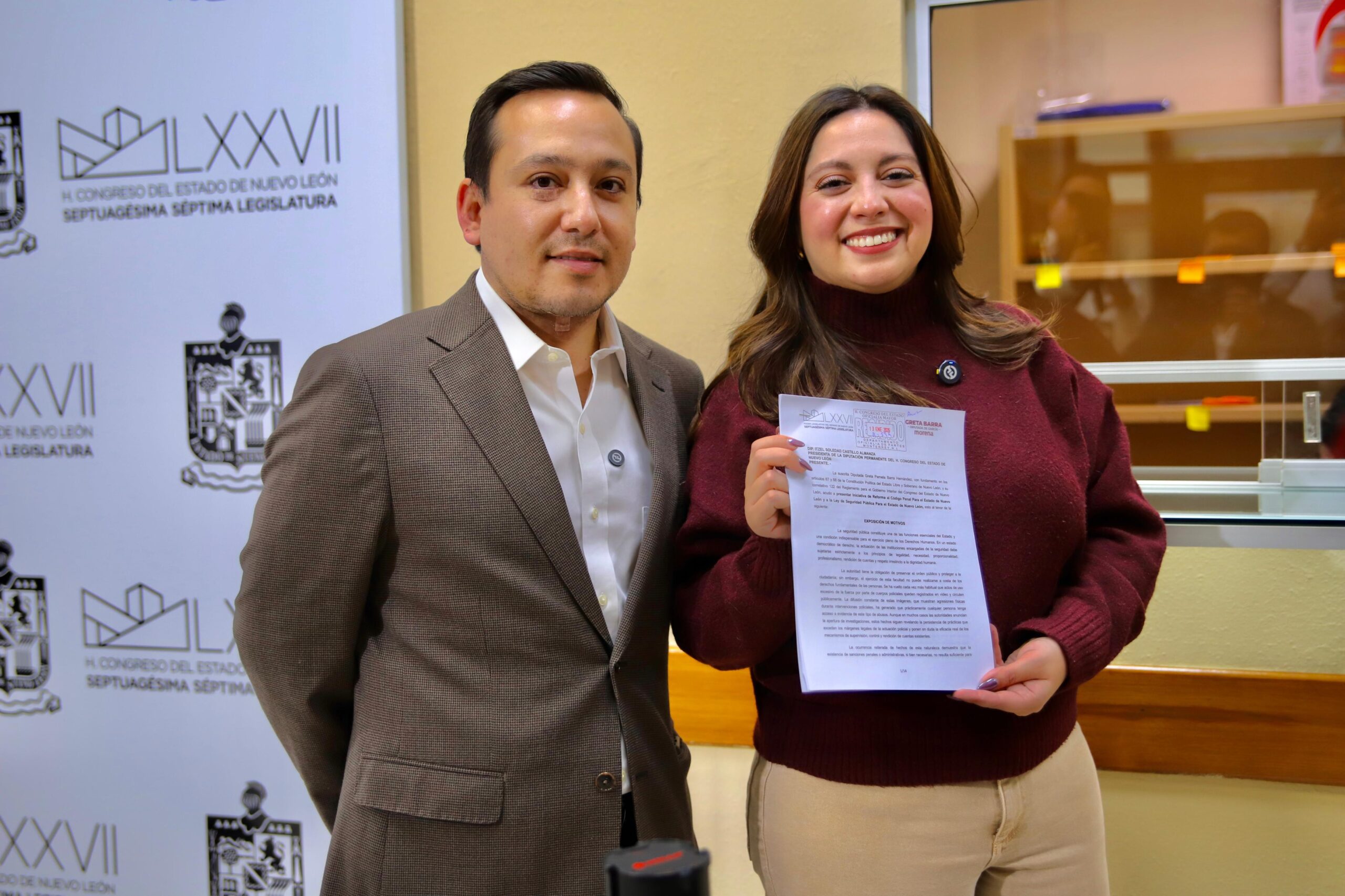 Greta Barra, junto a Gibrán Ornelas, Regidor de Morena por Monterrey; señaló que la iniciativa plantea que el abuso de autoridad por parte de un servidor público, podrá ser sancionado con hasta 6 años de prisión y multa de 200 a 600 cuotas.
