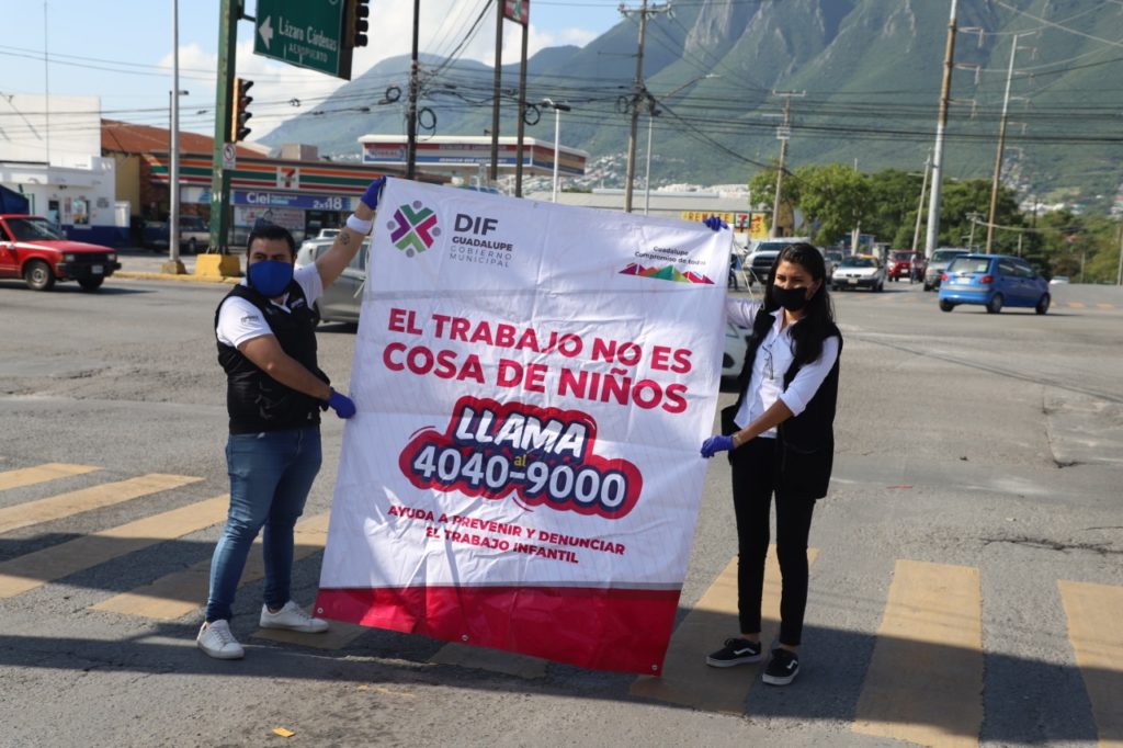 En el Día Mundial contra el Trabajo Infantil, la Alcaldesa Cristina Díaz y el Presidente de DIF Guadalupe, Tomás Montoya, reforzaron con una campaña de concientización para automovilistas la Súper Línea de Protección 4040 9000.