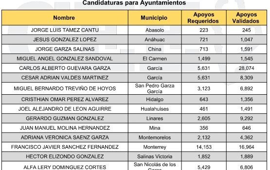 En Sesión Extraordinaria virtual de este 16 de febrero, la CEE informó que, de acuerdo con los resultados definitivos remitidos por el INE, las personas aspirantes a candidaturas independientes para Ayuntamientos y Diputaciones locales que alcanzaron los apoyos ciudadanos requeridos mediante la aplicación móvil y tienen derecho a una candidatura independiente son las y los siguientes: