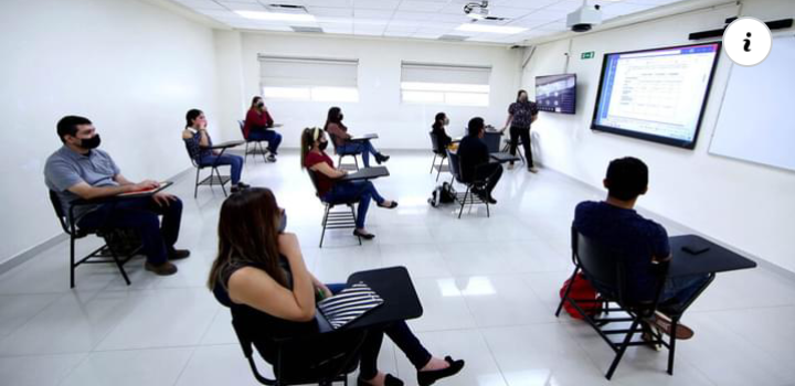 En su caso, cuentan con dos aulas totalmente equipadas para impartir las asignaturas del modelo híbrido con 10 o menos alumnos por cada clase. Que corresponde a menos del 30 por ciento de la cantidad de estudiantes para cada curso.